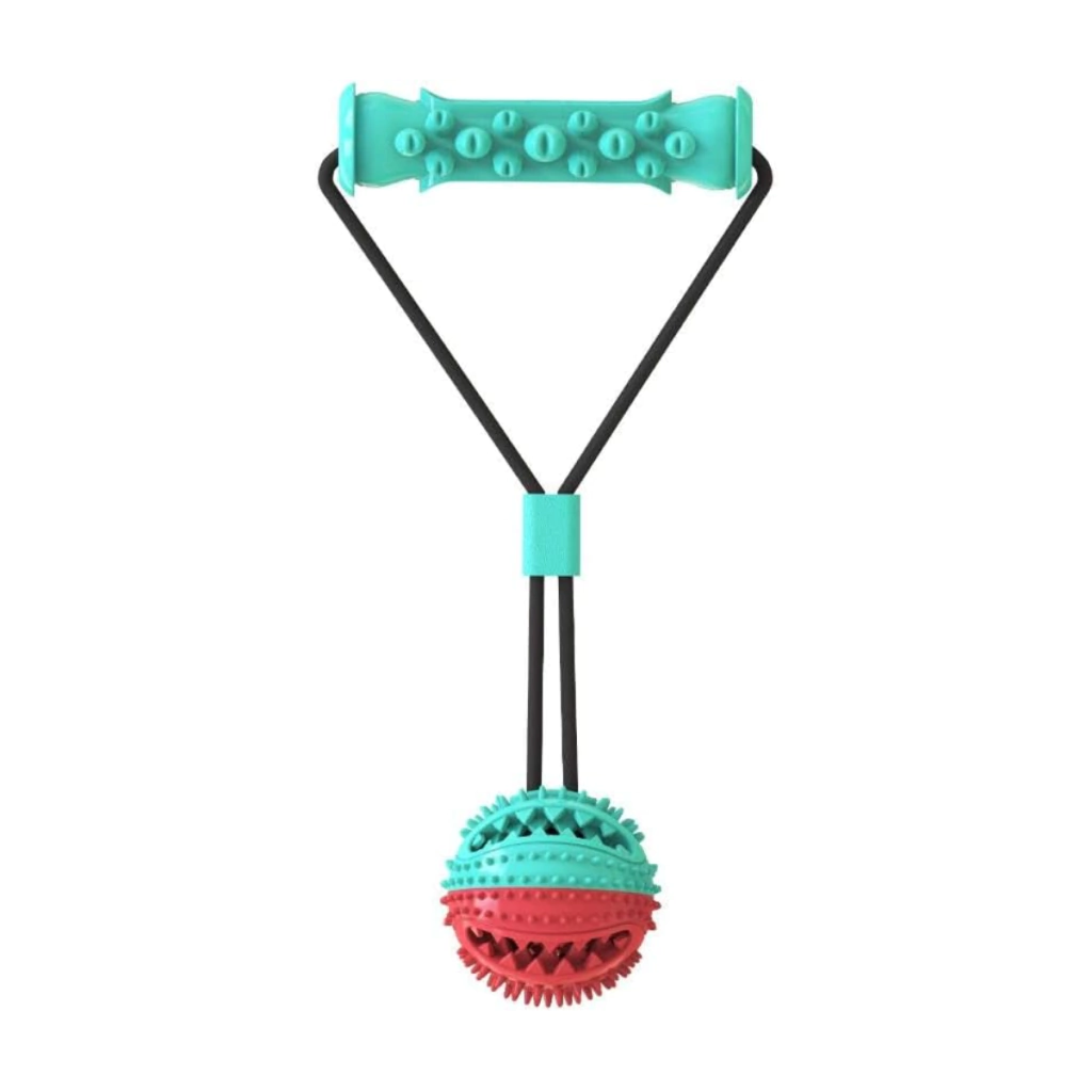 Fabricado em borracha TPR super resistente, o brinquedo combina uma bola texturizada com cerdas massageadoras e um cabo elástico reforçado, garantindo diversão segura e duradoura.