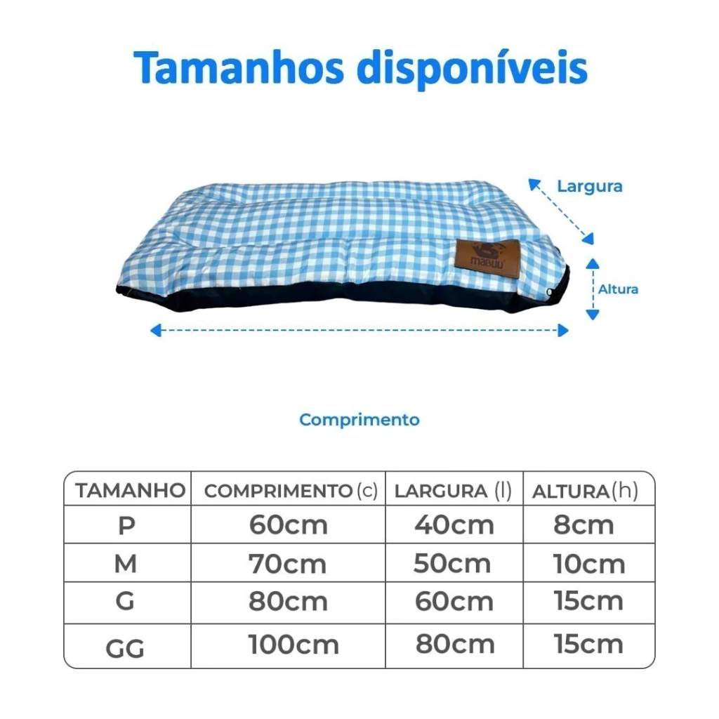 • GG: 100 cm (C) x 80 cm (L) x 15 cm (A) (espaçoso para raças grandes)